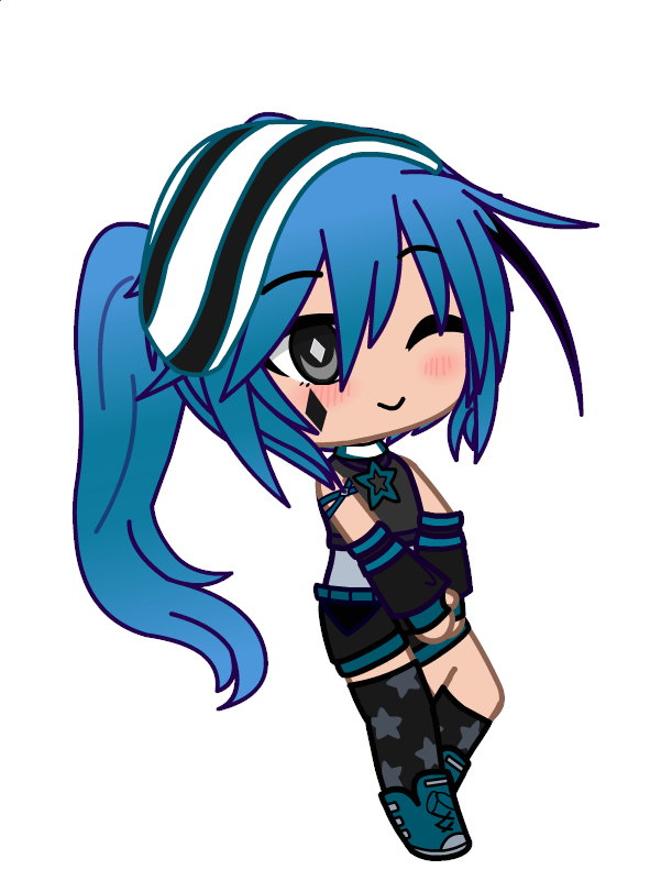 She has a fair skin, black eyes, and waist-long blue hair which is styled into a messy ponytail. Her attire consists of a blue shirt, a black suit jacket that covers up her shirt, short black jeans, black socks with gray stars, dark blue shoes, a black-and-white hat, and black short sleeves which don't stick to her shirt.